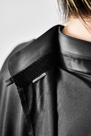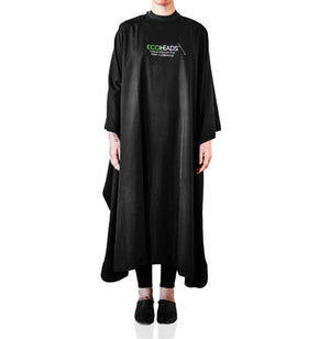 Beautiful and innovative salon cape that features a premium, hypoallergenic silicone neckline that protects the client from hair or water falling below the cape, but is breathable for optimal comfort during the service and easy for hair to slide off.